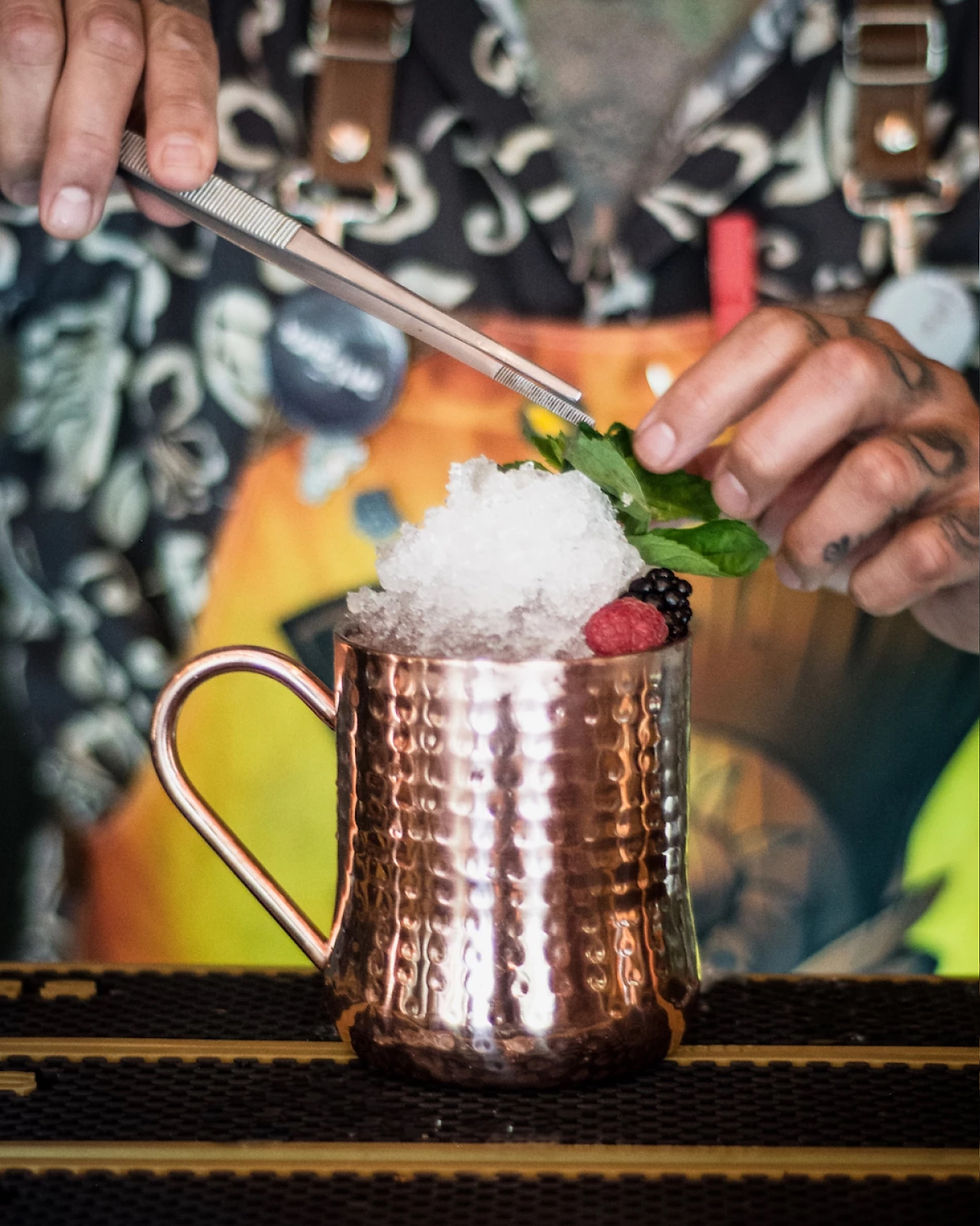 Vierte todos los ingredientes con hielo triturado en una taza de metal, preferentemente de cobre.
