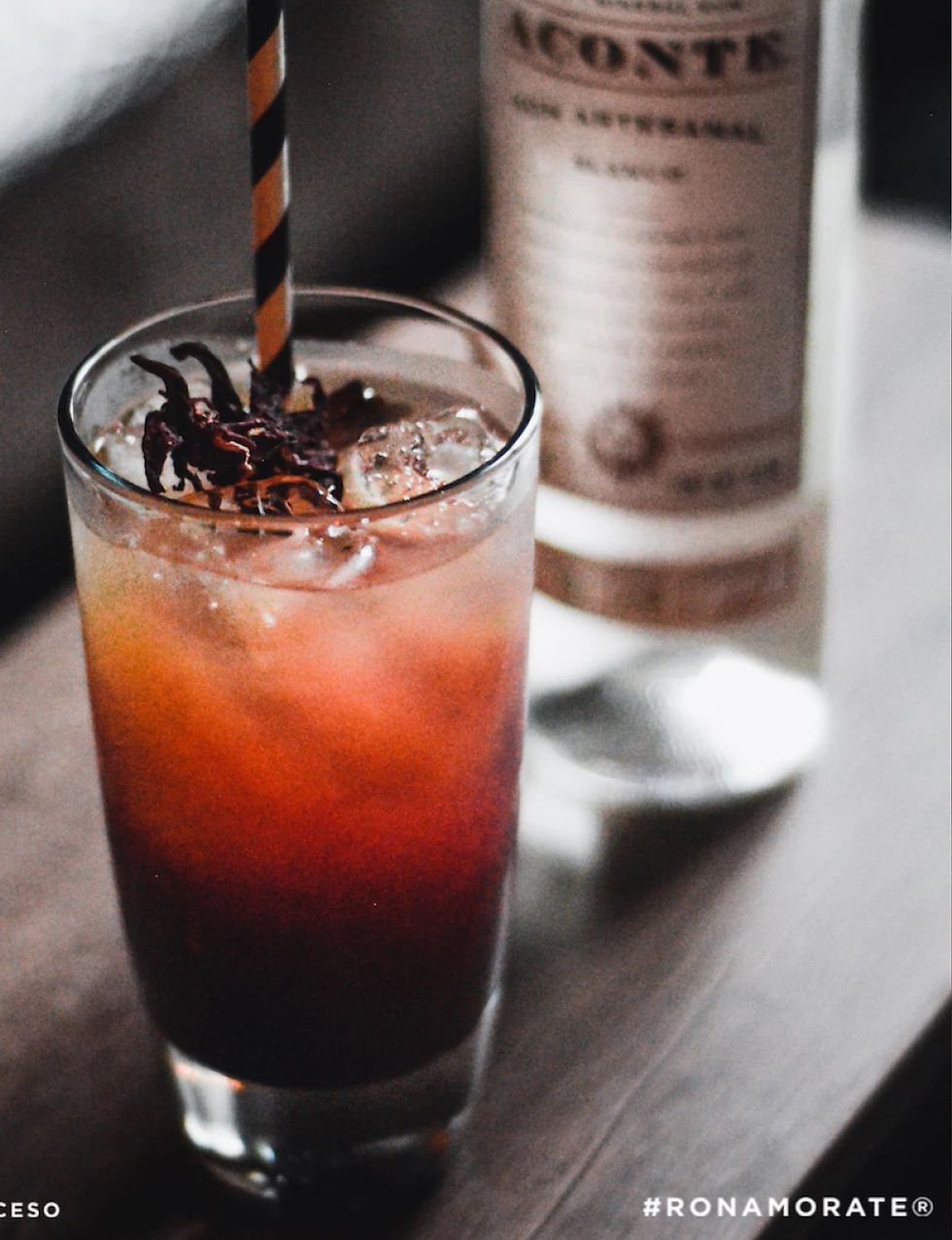 Infusiona 45 ml de ron Aconte Blanco con un sobre de té de durazno durante 30 min.