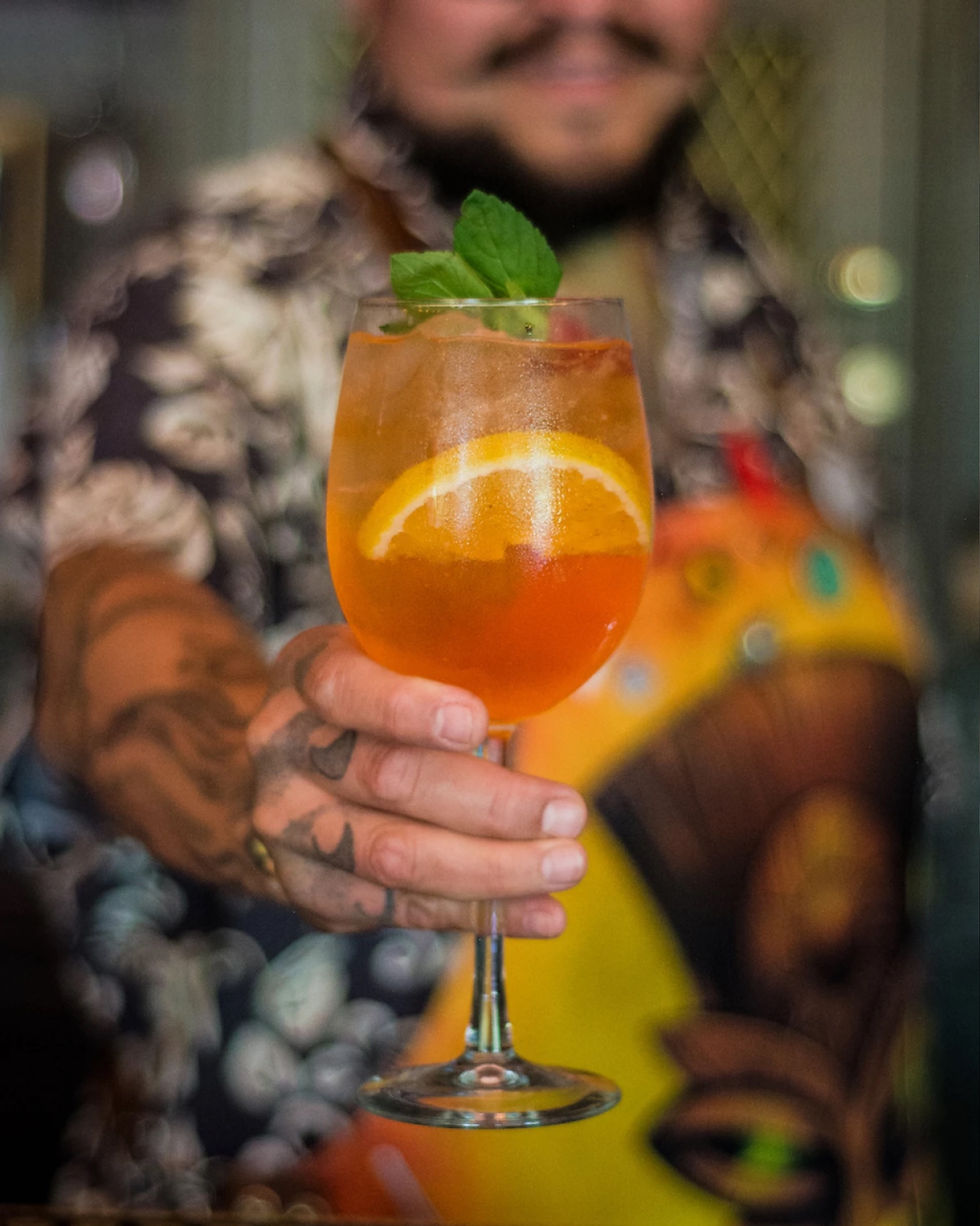 Sirve los ingredientes en una copa de vino con media rodaja de naranja fresca.